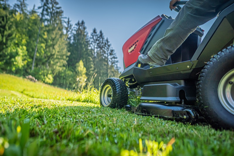 Údržba zahradních ploch zahradním traktůrkem se sběrem do koše.